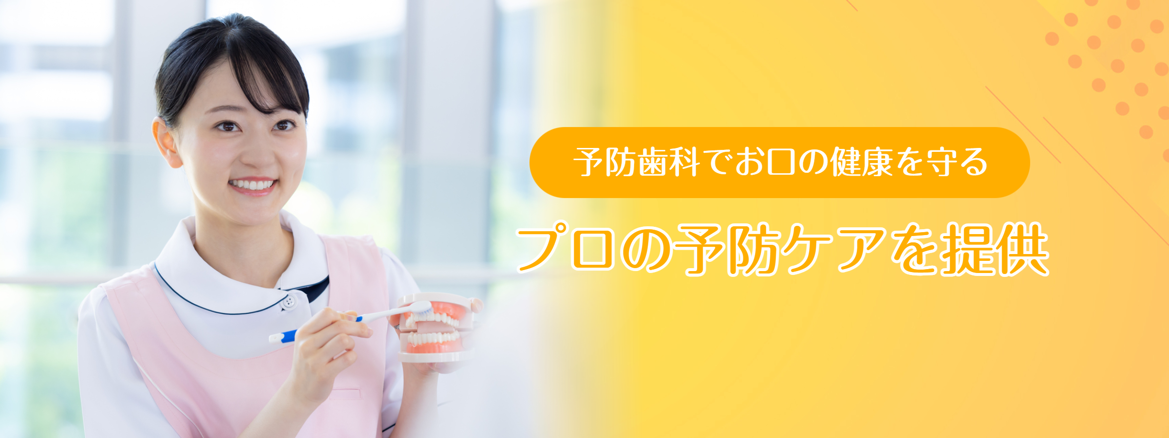 お子さまからご高齢の方まで皆さまのお口の健康をサポートしたいと考え、予防歯科に力を入れています。患者さまのお口の状況やご希望に合わせた治療をご提供する歯科医院です。