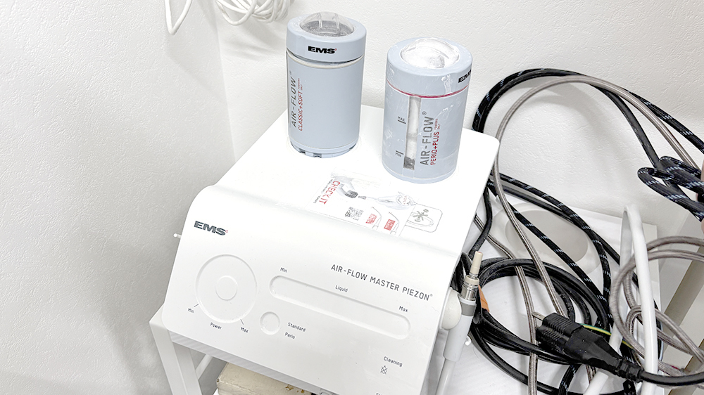 細かなパウダーを歯の表面に吹きつけ、バイオフィルム(細菌の膜)、プラーク(歯垢)、茶渋、タバコのヤニなどを落とします。